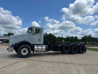 Bombshell grey and black KW T800 Roll-off for sale in Texas! Only 189K miles, Paccar MX 13 engine, 8LL manual transmission, double frame, 20/20/46K axles. Galbreath 75K hoist!